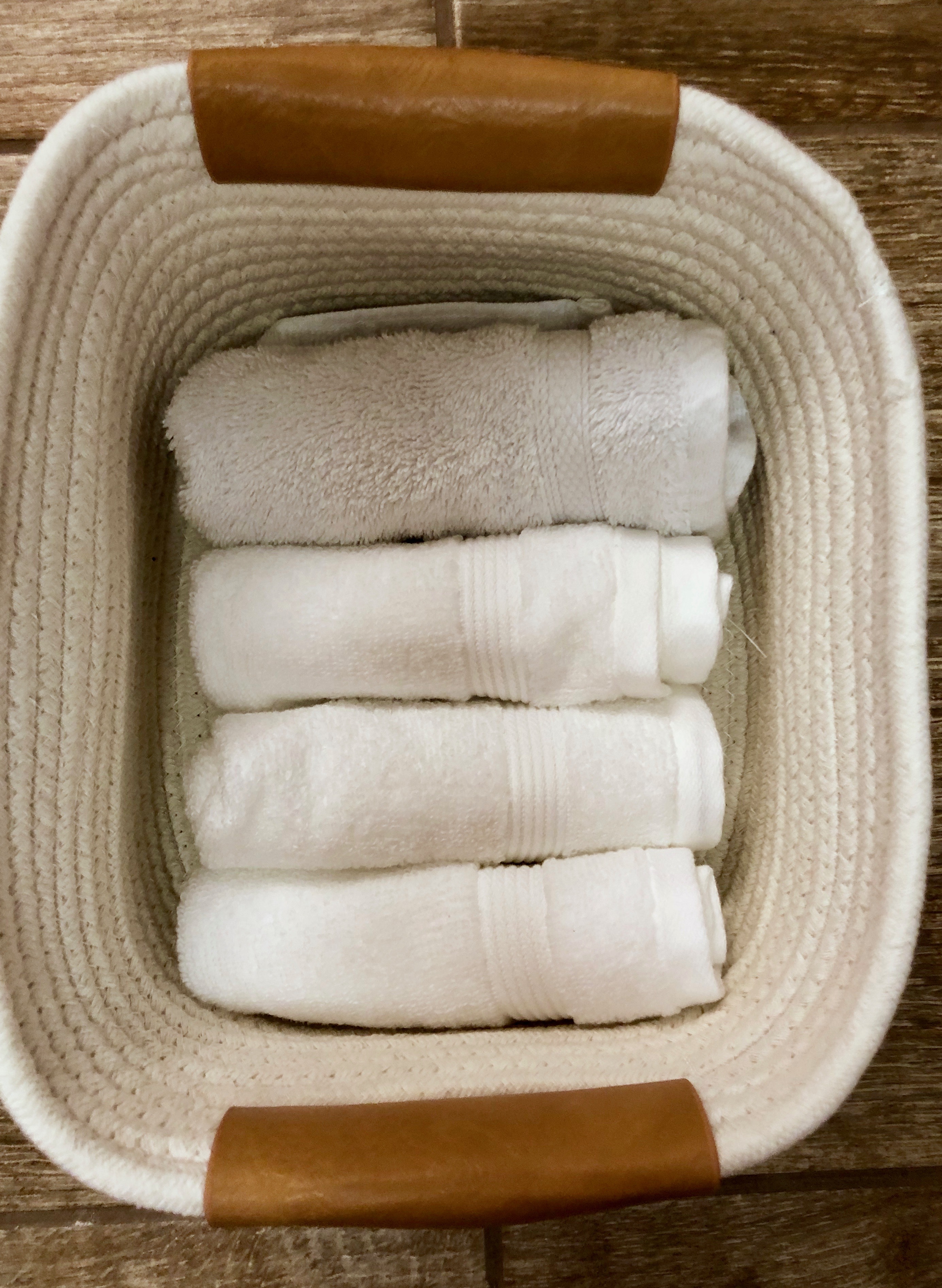 These large milk crate baskets are perfect for holding towels. I just stack them upright one behind the other. If you are slightly OCD like me make sure you use all the same colors. I chose white but any color that matches your decor will work perfectly. This towel set from amazon has great reviews.