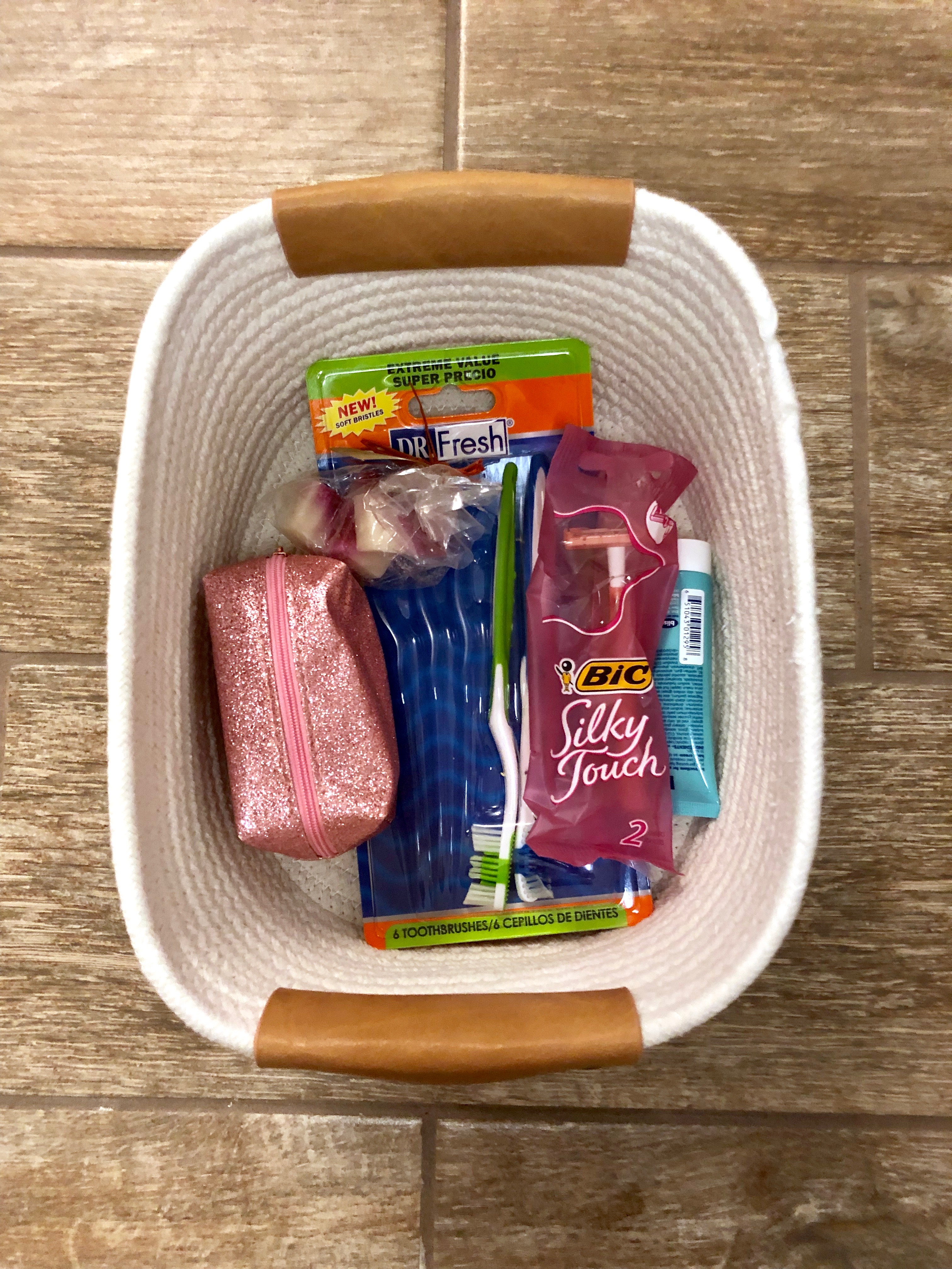 I used the same small basket on the second shelf. In this basket I put a few random items that might be helpful to guests such as razors, toothbrushes, soap, and a small travel kit. I feel that it is small details like these that make your guests feel right at home!